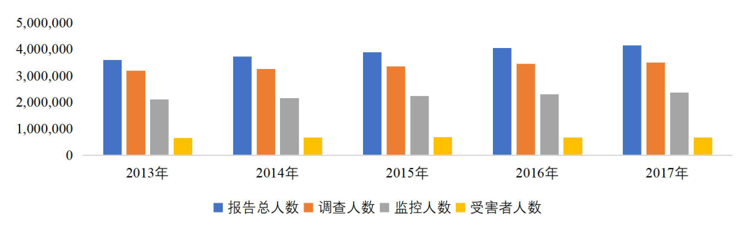 兒童強(qiáng)制報(bào)告數(shù)量越多,越反映出社會(huì)關(guān)注兒童問題的重視程度。今后,兒童侵害強(qiáng)制報(bào)告將成為兒童侵害案件主要來源,健全并落實(shí)兒童侵害強(qiáng)制報(bào)告制度,有利于越來越多的兒童受侵害案件及時(shí)發(fā)現(xiàn)并得到有效處置。以美國為例,2017年公眾以及強(qiáng)制報(bào)告責(zé)任主體向相關(guān)部門報(bào)告的案件數(shù)超過400萬件,占美國全部兒童數(shù)量的5.6%,即每百名兒童中有超過5名兒童被舉報(bào)懷疑遭受家庭忽視或虐待。