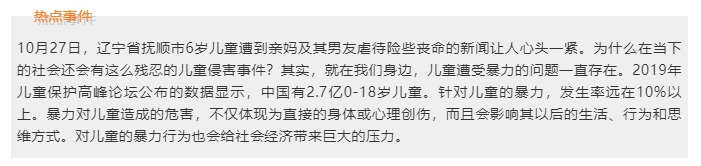 聯(lián)合國相關研究顯示,兒童在成長早期遭受暴力不僅使其身心發(fā)展、行為及社會交往受到影響,這些創(chuàng)傷很可能影響兒童成年后信任關系、親密關系和其他社會關系的健康發(fā)展,甚至會增加暴力行為的代際傳遞,從而產生一系列的社會問題。