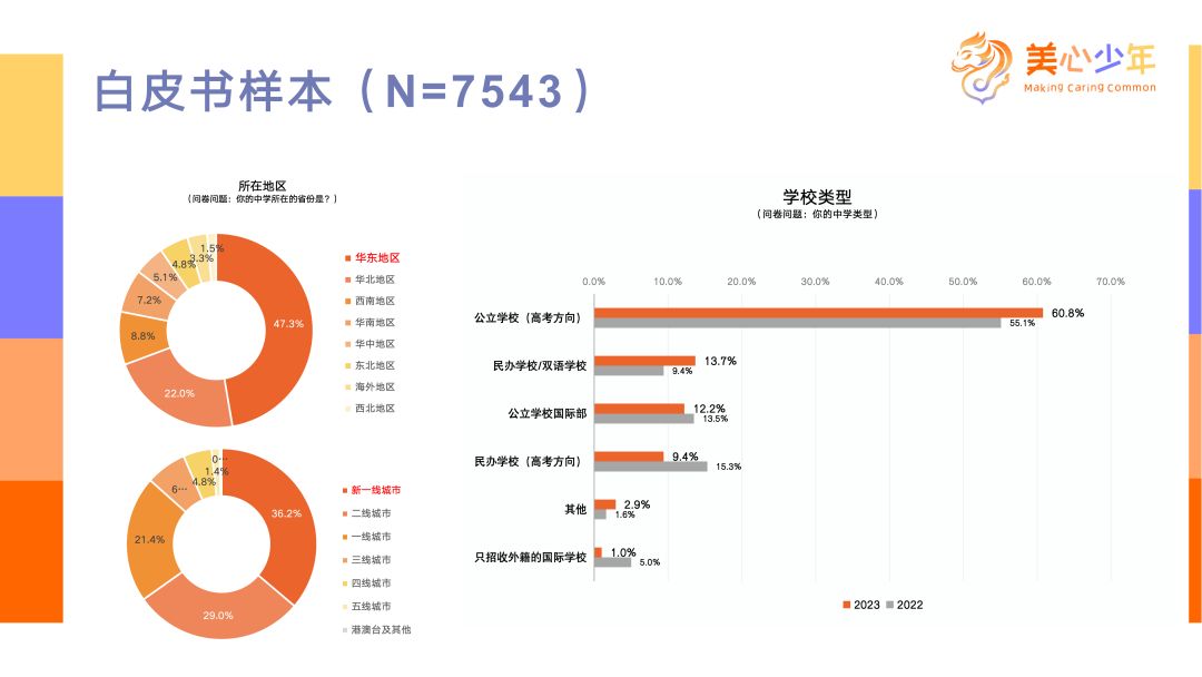 剛才主持人提到,今年的調(diào)查與往年相似,收集到七千多名中學(xué)生的反饋,他們主要來自華東、華北、全國各地,包括部分來自港澳和臺灣的學(xué)生,以及在海外學(xué)習(xí)的中國學(xué)生。他們主要分布在城市,尤其是新一線城市、一線城市和二線城市,占比較高。這些學(xué)生大多就讀于公立學(xué)校,其結(jié)構(gòu)與中國慈善活躍地區(qū)的布局和學(xué)生組成相一致,所以這個問卷調(diào)查對我們了解中學(xué)生參與公益的整體情況提供了較大參考價值。