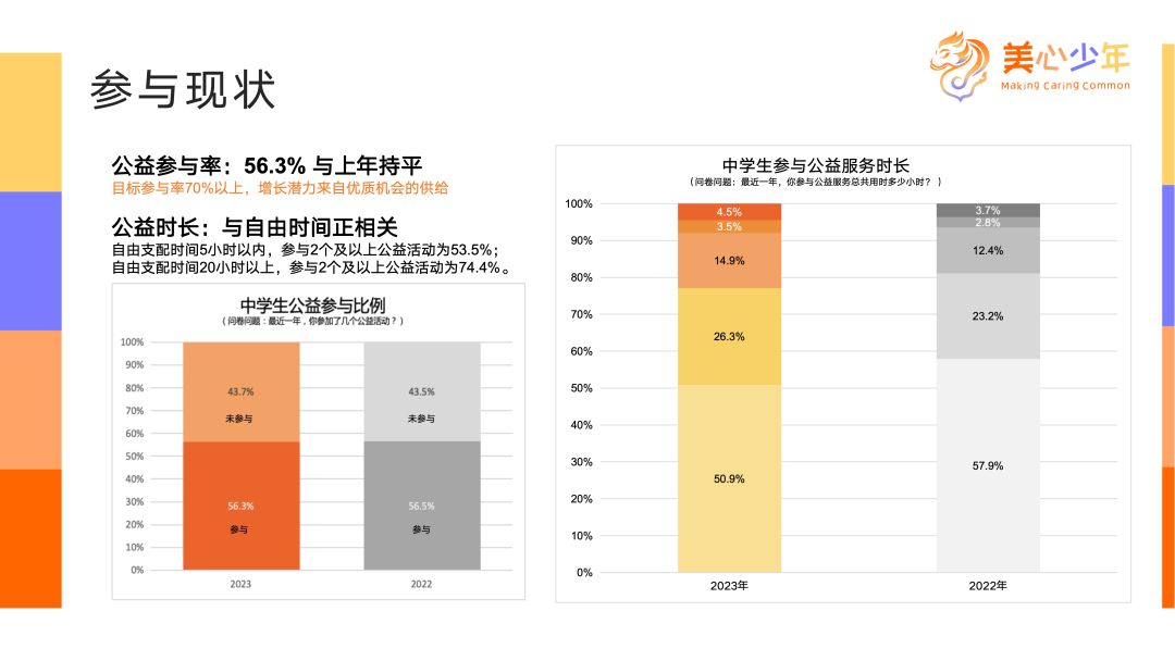感謝主持人,同時也感謝易善、益行者、鳳凰公益在過去幾年對中學(xué)生公益實(shí)踐的持續(xù)關(guān)注和跟蹤研究。今年是中國公益研究院首次參與問卷分析,在此我受委托,代表合作三方機(jī)構(gòu)及研究院團(tuán)隊(duì),快速分享我們在數(shù)據(jù)分析方面的發(fā)現(xiàn)。