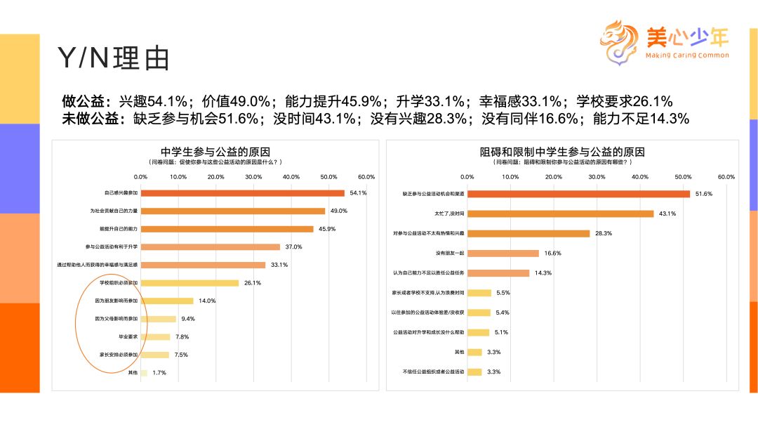 孩子們參與公益的原因有哪些?首先是因?yàn)橛腥ぃ@符合他們的天性;其次是因?yàn)橛幸饬x,能夠幫助他人,體現(xiàn)了這代孩子內(nèi)心的善良;再者,參與公益活動能提升自身能力,符合學(xué)生的特點(diǎn);最后,出于實(shí)用目的——除了幸福感和滿足感——大約四分之一的學(xué)生因?yàn)閷W(xué)校的要求而參與公益。我們認(rèn)為這也是一種積極的引導(dǎo)。