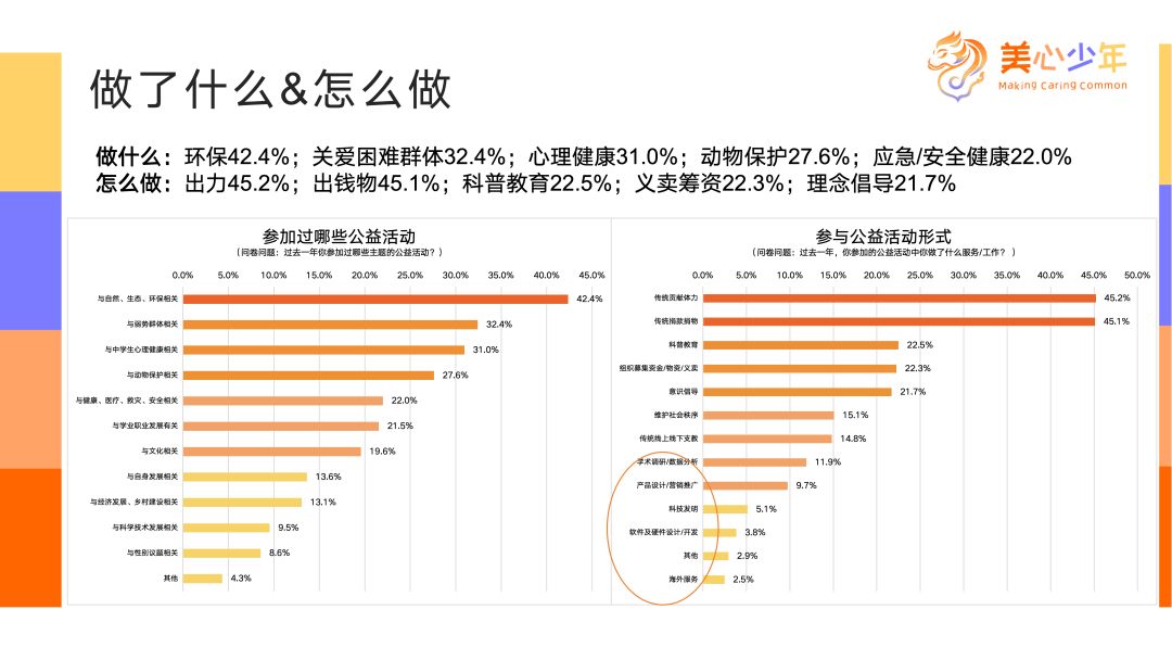那56%參與公益活動的孩子主要參與了哪些方面的公益呢?這個特別有意思。第一個內(nèi)容是環(huán)保——這也是我們今天活動的主題。環(huán)保議題跟氣候變化相關(guān),跟美化環(huán)境、垃圾分類都相關(guān),內(nèi)容比較豐富。第二個內(nèi)容是關(guān)愛困難群體,包括扶貧助困。有意思的是,心理健康是今年中學(xué)生做公益選擇的第三大內(nèi)容,這是近幾年涌現(xiàn)的新趨勢,非常值得關(guān)注。還有動物保護(hù)、跟應(yīng)急和其他相關(guān)的,跟我們過去幾年的衛(wèi)生、安全、救災(zāi)方面相關(guān),所以前面五大主題基本反映了當(dāng)下的社會需求,以及孩子們的自主意愿。