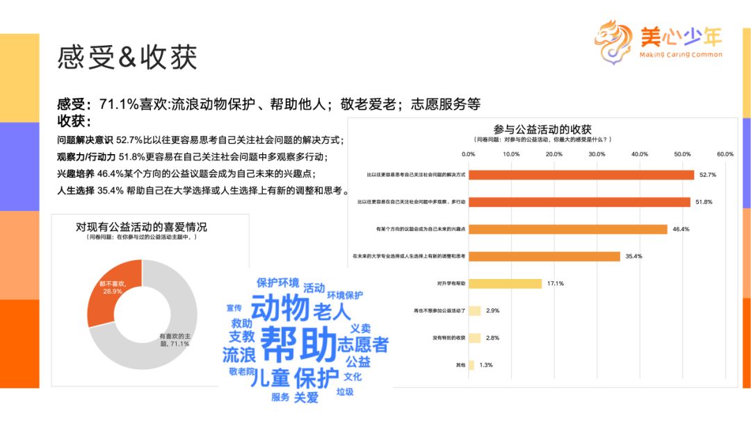 他們參與公益活動的感受如何?從中收獲了什么?這個數(shù)據(jù)比較有意思。71%的孩子表示喜歡參與公益活動。我們過往的調(diào)查也發(fā)現(xiàn),孩子們一走出教室就覺得開心。所以這里面,公益天然的魅力和吸引力就具有了。還有一小部分學(xué)生認(rèn)為公益活動不夠有趣。這取決于具體的活動內(nèi)容和形式,因?yàn)楝F(xiàn)實(shí)中確實(shí)有很多公益活動不太吸引人。