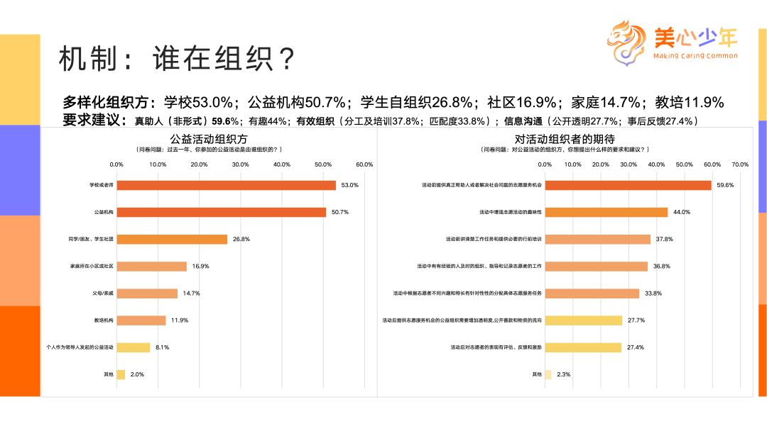 但這些組織的活動效果如何?從孩子要求和建議來看,發(fā)現(xiàn)還有進(jìn)一步提升的空間。首先,活動必須真有用,真正能夠幫助到他人,這是孩子們的主要訴求。第二大訴求就是組織要充分準(zhǔn)備、科學(xué)有效,就是說要提前培訓(xùn)、做很好的分工,分工要跟人的興趣特長匹配;另外,活動結(jié)束后應(yīng)給予一些反饋,這是孩子們的期望。所以從事前、事中、事后都要有明確的指導(dǎo)。