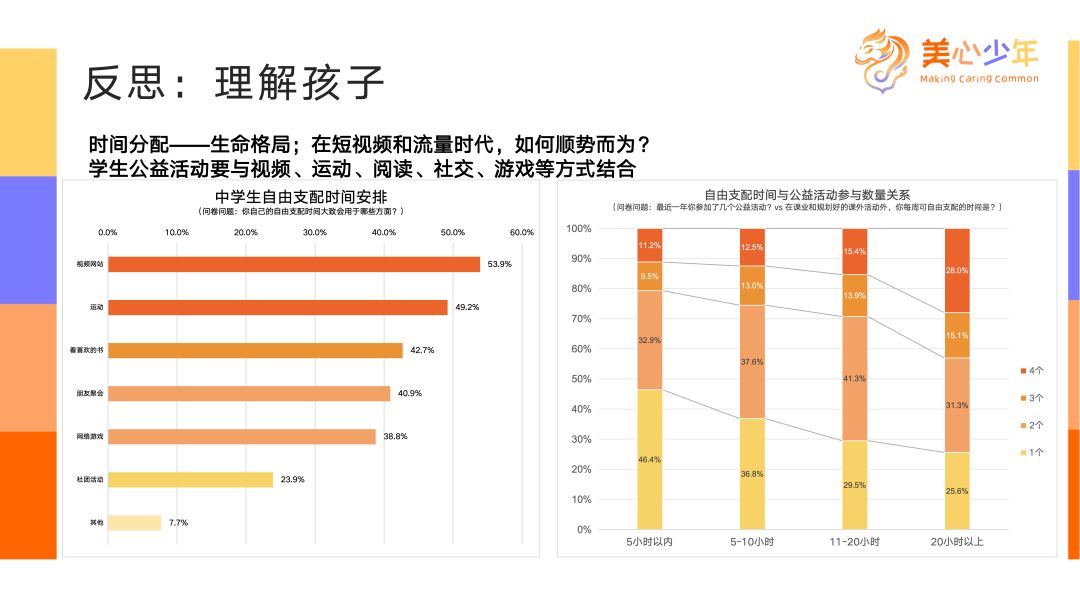 最后,我們呼吁:作為青少年公益活動的供給側(cè),我們要提升自己的服務(wù)水平。首先是這事要好玩,其次要方便,隨時隨地好參加;當(dāng)然最本質(zhì)最主要的是孩子為主體,尊重他們的自主性。這是我們強(qiáng)烈的呼吁和號召。